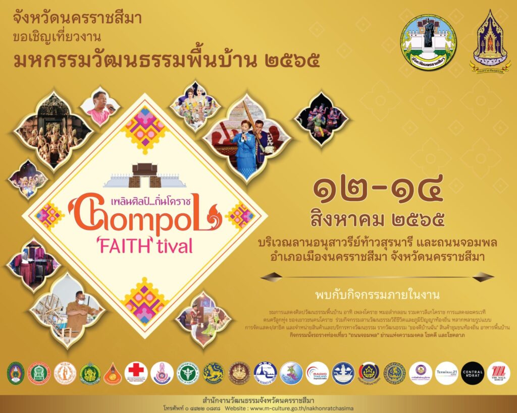 จังหวัดนครราชสีมา ขอเชิญร่วมงาน มหกรรมวัฒธรรมพื้นบ้าน “เพลินศิลป์ ถิ่นโคราช” Chompol “Faith” tival ภายในงานพบกับ การแสดงศิลปวัฒนธรรมพื้นบ้าน อาทิ เพลงโคราช หมอลำกลอน รวมดาวลิเกโคราช การแสดงละครเวที ดนตรีลูกทุ่ง ของเยาวชนคนโคราช ร่วมกิจกรรมลานวัฒนธรรมวิถีชีวิตและภูมิปัญญาท้องถิ่น การสาธิตหลากหลายรูปแบบ พบกับสินค้าและบริการทางวัฒนธรรม CPOT “ของดีบ้านฉัน” สินค้าชุมชนท้องถิ่น กว่า 50 ร้านค้า และกิจกรรมนั่งรถรางท่องเที่ยว “ถนนจอมพล” ย่านแห่งความมงคล โชคดี และโชคลาภ พบกันในวันที่ 12 – 14 สิงหาคมนี้ ณ บริเวณลานอนุสาวรีย์ท้าวสุรนารี และถนนจอมพล ตั้งแต่เวลา 10.00 – 22.00 น. เต็มอิ่ม จุใจตลอด 3 วัน กับงานมหกรรมวัฒธรรมพื้นบ้าน 2565