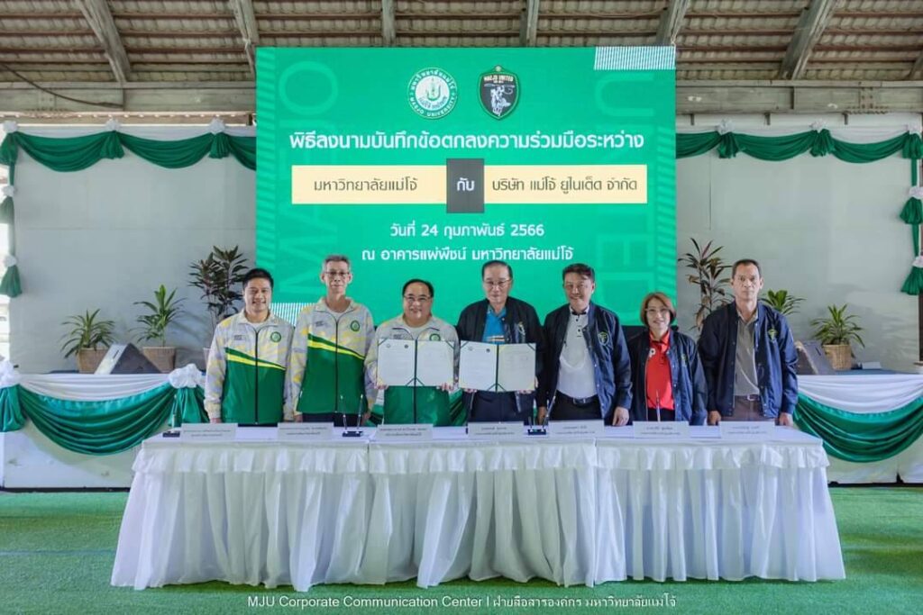 วันศุกร์ที่ 24 กุมภาพันธ์ 2566 มหาวิทยาลัยแม่โจ้ จัดพิธีลงนามบันทึกข้อตกลงความร่วมมือ กับ บริษัท แม่โจ้ ยูไนเต็ด จำกัด โดยมี รองศาสตราจารย์ ดร.วีระพล ทองมา อธิการบดีมหาวิทยาลัยแม่โจ้ และ นายณรงค์ สุวภาพ และ นายกฤษดา ภักดี กรรมการบริษัท แม่โจ้ ยูไนเต็ด จำกัด เป็นผู้แทนลงนามของทั้งสองฝ่าย พร้อมด้วยคณะผู้บริหารของทั้ง 2 หน่วยงานร่วมเป็นสักขีพยาน ณ อาคารแผ่พืชน์ มหาวิทยาลัยแม่โจ้ จ.เชียงใหม่