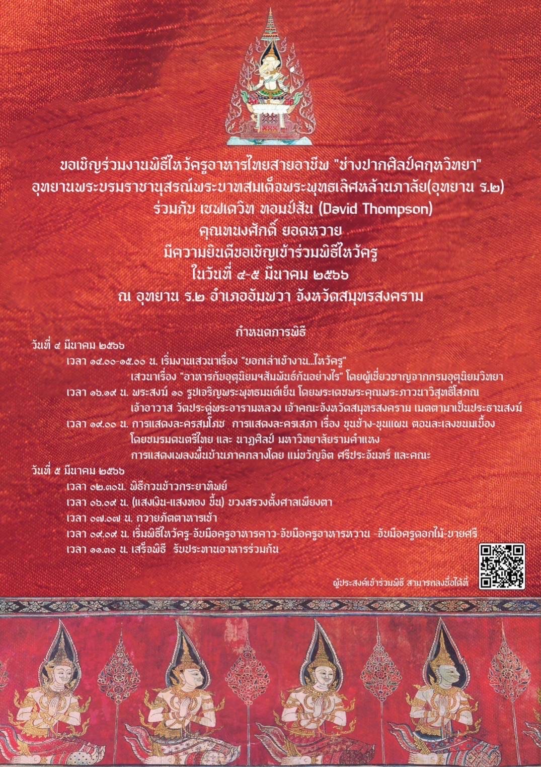 ร่วมกับ เชฟเดวิท ทอมป์สัน (David Thompson) คุณทนงศักดิ์ ยอดหวาย มีความยินดีขอเชิญเข้าร่วมพิธีไหว้ครู 📆ในวันที่ ๔-๕ มีนาคม ๒๕๖๖ ณ อุทยาน ร.๒ อำเภออัมพวา จังหวัดสมุทรสงคราม