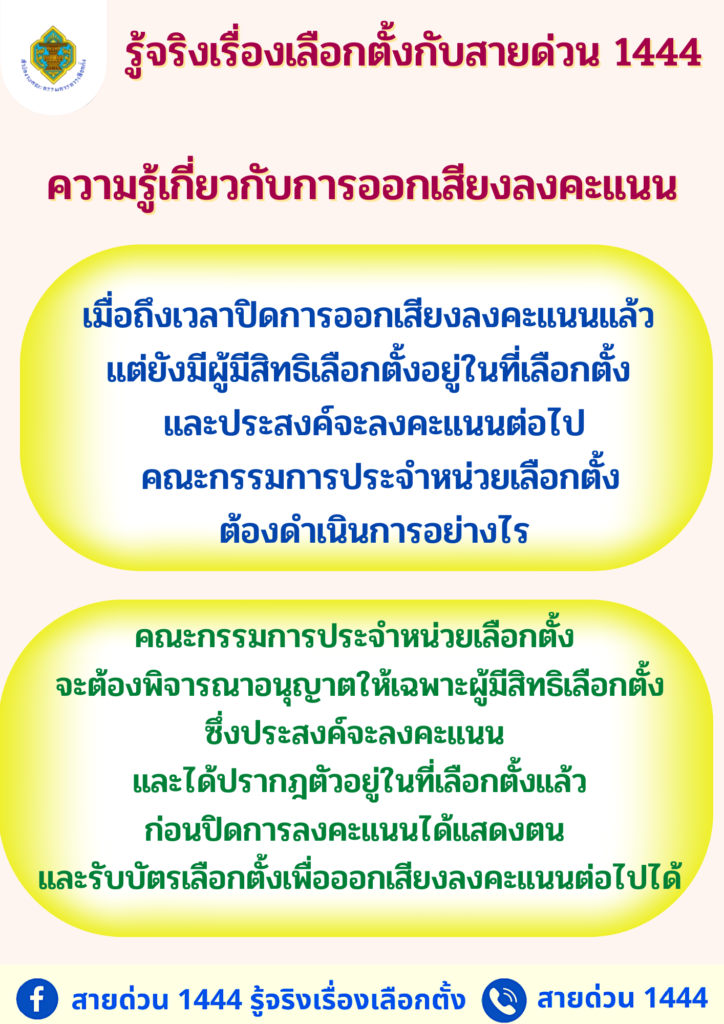 เมื่อถึงเวลาปิดการออกเสียงลงคะแนนแล้ว แต่ยังมีผู้มีสิทธิเลือกตั้งอยู่ในที่เลือกตั้ง และประสงค์จะลงคะแนนต่อไป คณะกรรมการประจําหน่วยเลือกตั้ง ต้องดำเนินการอย่างไร