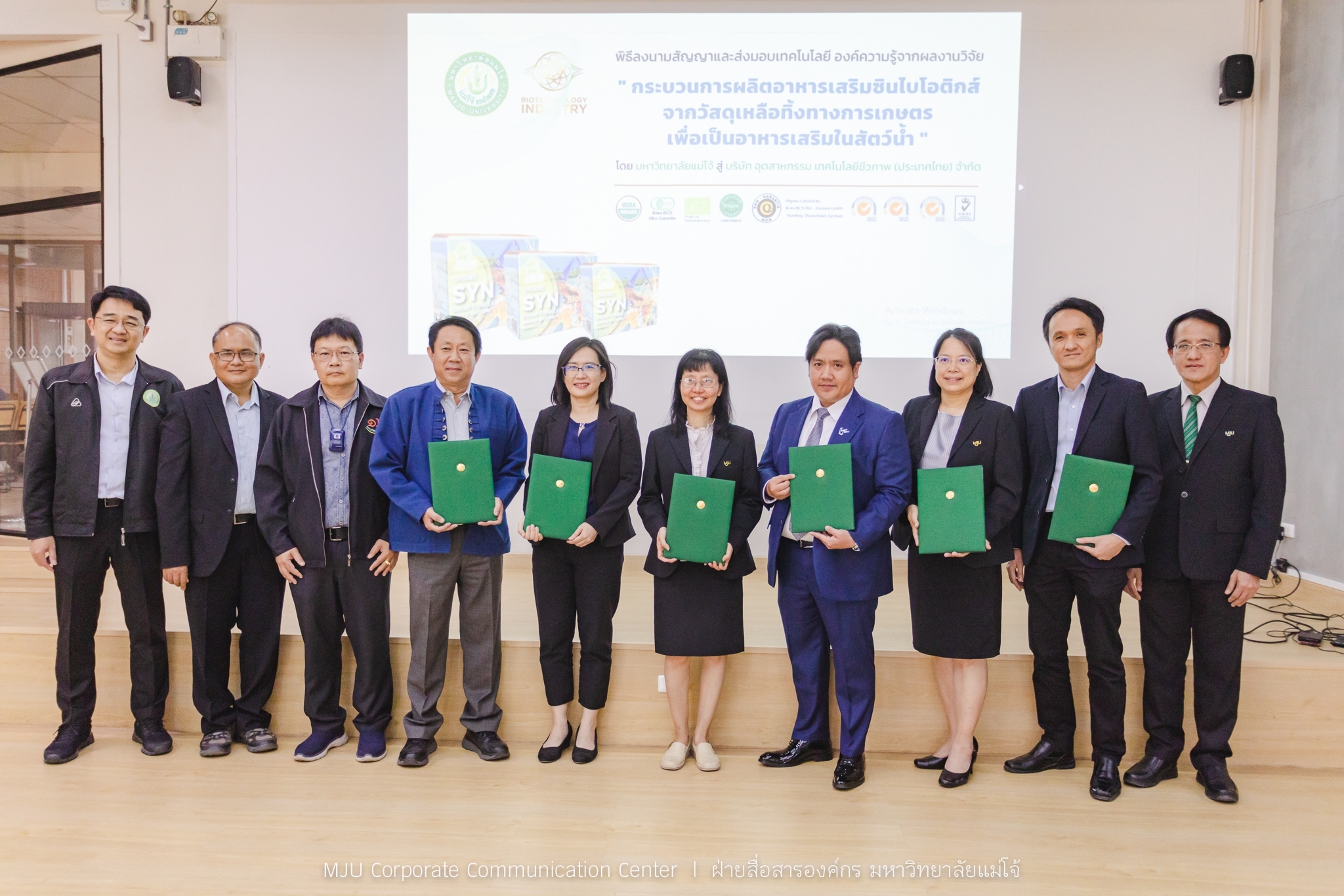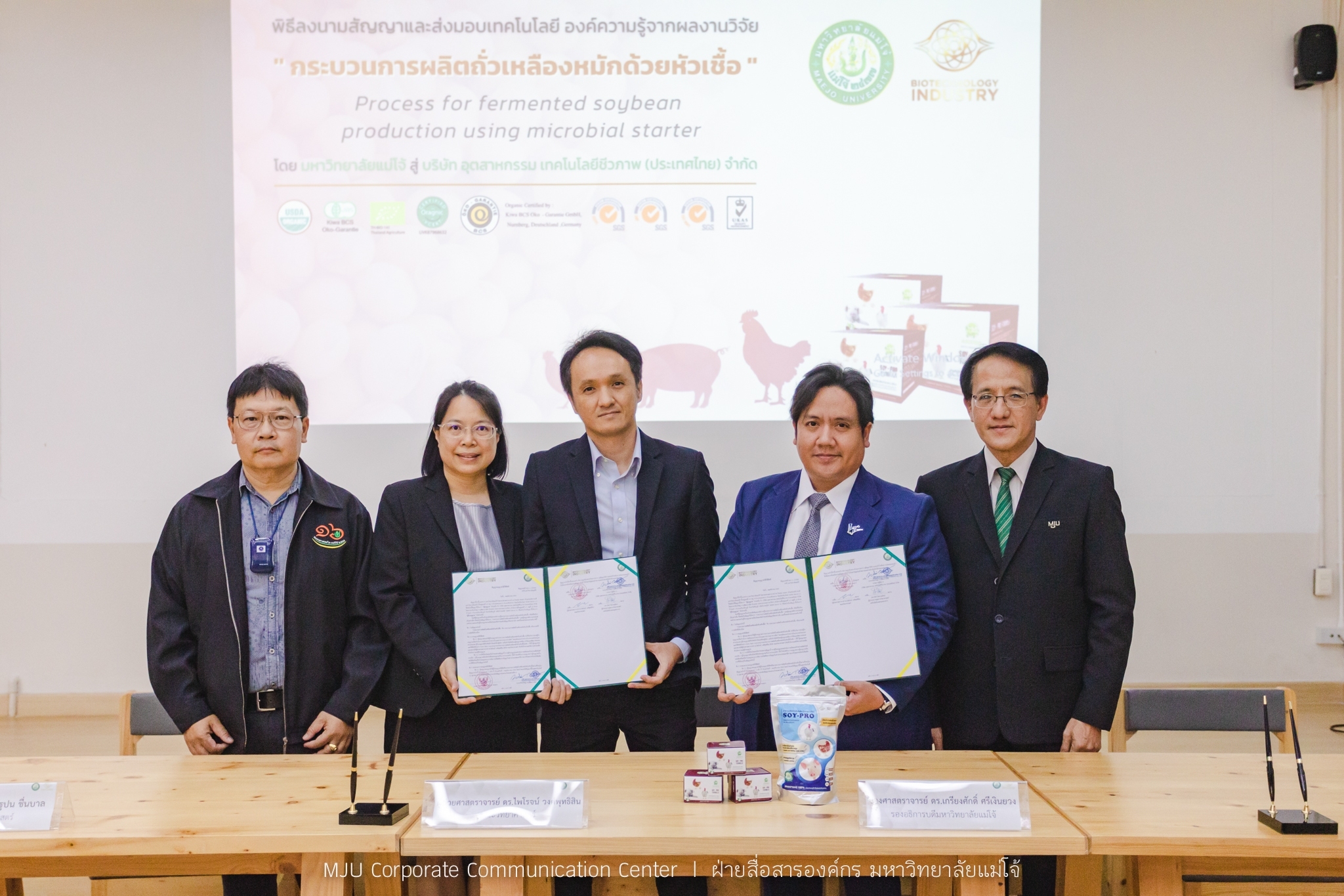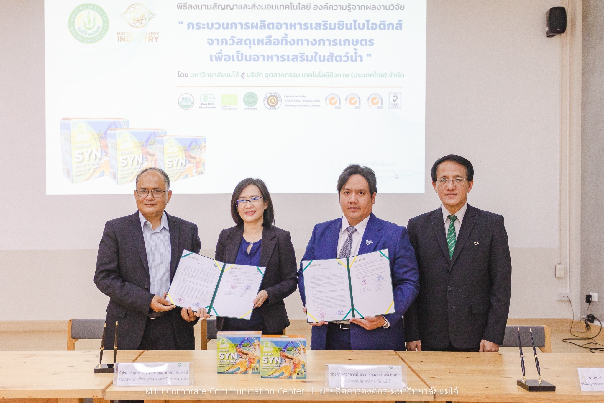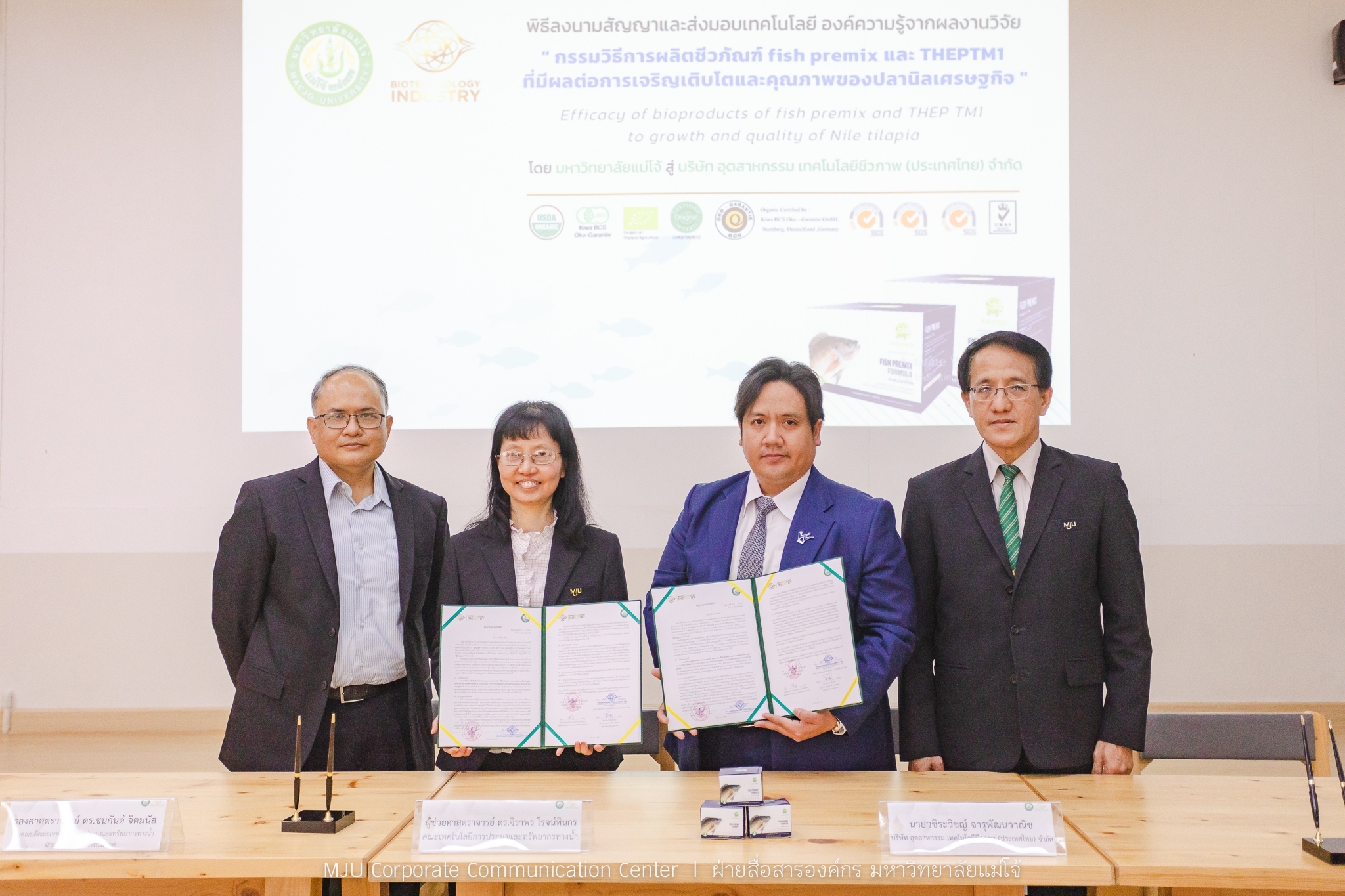 รองศาสตราจารย์ ดร.เกรียงศักดิ์ ศรีเงินยวง รองอธิการบดี กล่าวว่า “การลงนามสัญญาอนุญาตให้ใช้สิทธิในผลงานวิจัย ภายใต้แนวคิดโดยการนำนวัตกรรมไปใช้ในเชิงธุรกิจ โดยการเชื่อมโยงองค์ความรู้และภูมิปัญญาจากผลงานวิจัยให้สามารถนำไปต่อยอดและขยายผลให้เกิดประโยชน์ได้อย่างเป็นรูปธรรม เป็นการประกาศเกียรติคุณสำหรับนักวิจัยและผู้ประกอบการที่มีส่วนส่งเสริมสนับสนุนให้มีนำผลงานวิจัยสิ่งประดิษฐ์และนวัตกรรมของมหาวิทยาลัยไปสู่ภาคธุรกิจอย่างมีศักยภาพ ขอบขอบคุณ บริษัท อุตสาหกรรม เทคโนโลยีซีวภาพ (ประเทศไทย) จำกัด ที่เห็นถึงคุณค่าของผลงานวิจัยของมหาวิทยาลัยแม่โจ้ และนักวิจัยที่ร่วมทุ่มเทสร้างงานวิจัยคุณภาพ จนได้เข้าร่วมลงนามในสัญญาอนุญาตใช้สิทธิ ที่ภาคเอกชนนำไปต่อยอดใช้ประโยชน์เชิงพาณิชย์ได้อย่างเป็นรูปธรรม และการแสดงผลิตภัณฑ์ต้นแบบจากบริษัทที่จะถูกผลิตและจำหน่ายออกสู่ตลาดต่อไปในอนาคต ทั้งนี้ มหาวิทยาลัยแม่โจ้ยินดีที่จะสนับสนุนการทำงานร่วมกับภาคเอกชนและประชาชนในรูปแบบอื่นอีก หลากหลายช่องทางเพื่อการพัฒนาเศรษฐกิจและชุมชนให้มีความเข้มแข็งต่อไป”
