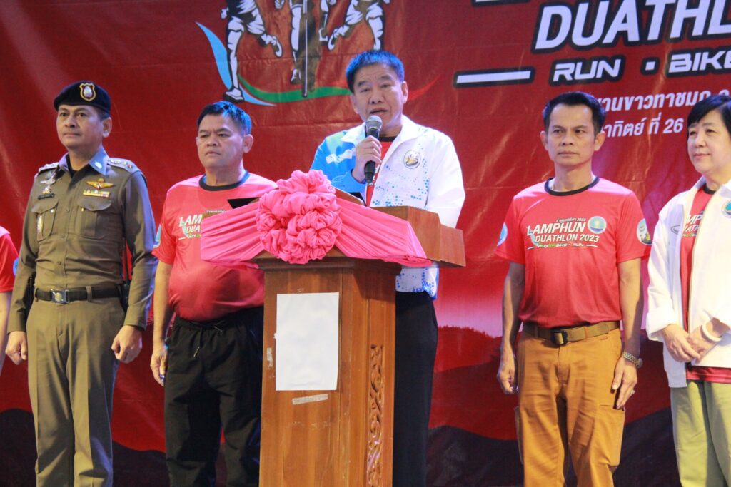 วันที่ 26 มีนาคม 2566 เวลา 06.00 น. ที่ ลานกิจกรรมบริเวณสะพานขาวทาชมภู ต.ทาปลาดุก อ.แม่ทา จังหวัดลำพูน นายสันติธร ยิ้มละมัย ผู้ว่าราชการจังหวัดลำพูนมอบหมายให้นายชาตรี กิตติธนดิตถ์ รองผู้ว่าราชการจังหวัดลำพูน เป็นประธานเปิดกิจกรรม “ลำพูนทวิกีฬา 2023” LAMPHUN DUATHSON 2023 ภายใต้โครงการ 1 จังหวัด 1 Sport Event โดยมี นายจักรกฤษณ์ เอ่งฉ้วน ท่องเที่ยวและกีฬาจังหวัดลำพูน นายประกอบ ยอดยา นายอำเภอแม่ทา หัวหน้าส่วนราชการ ผู้เข้าร่วมการแข่งขันทั้งชาวไทยและชาวต่างชาติเข้าร่วมกิจกรรมเป็นจำนวนมาก