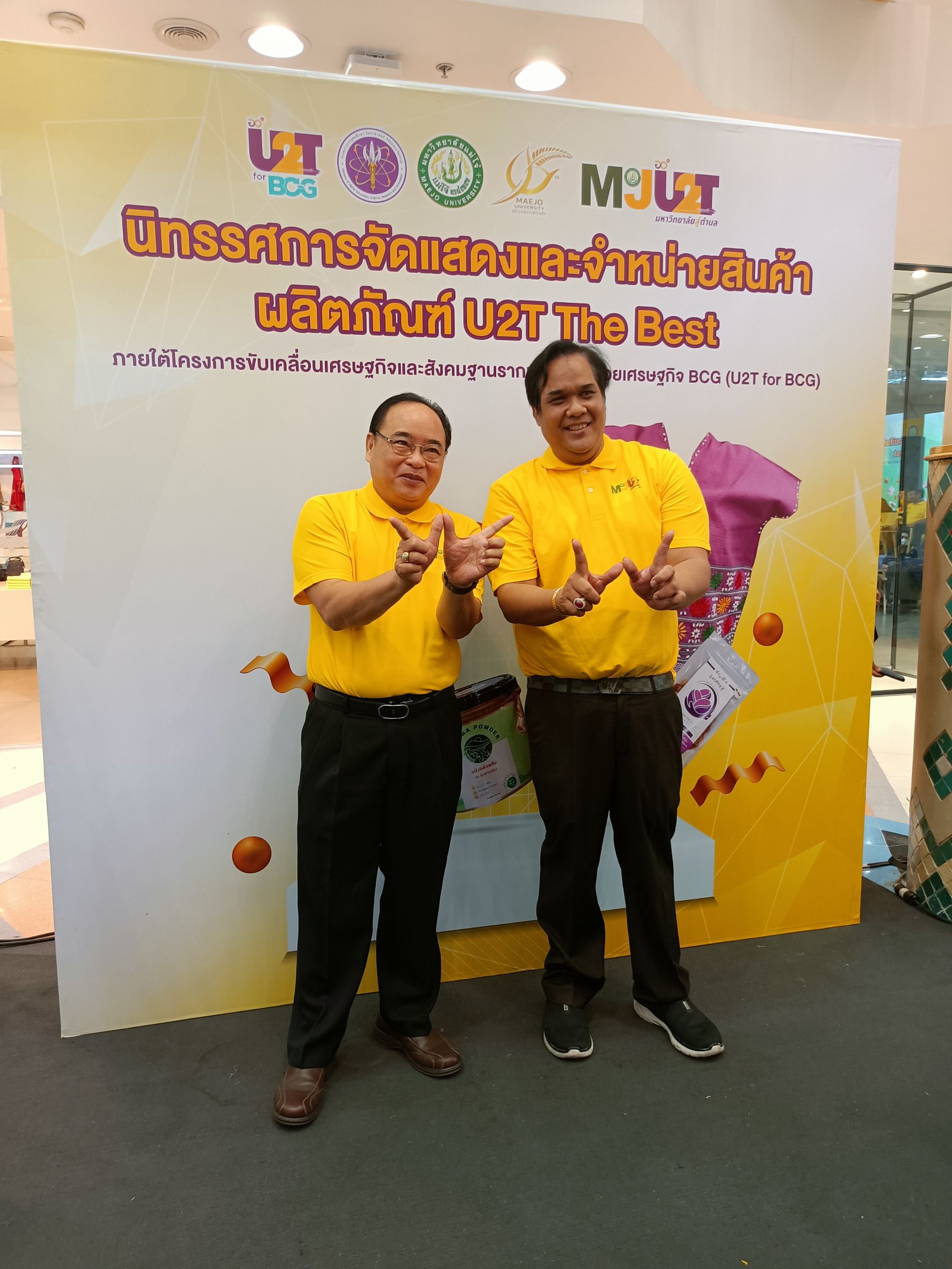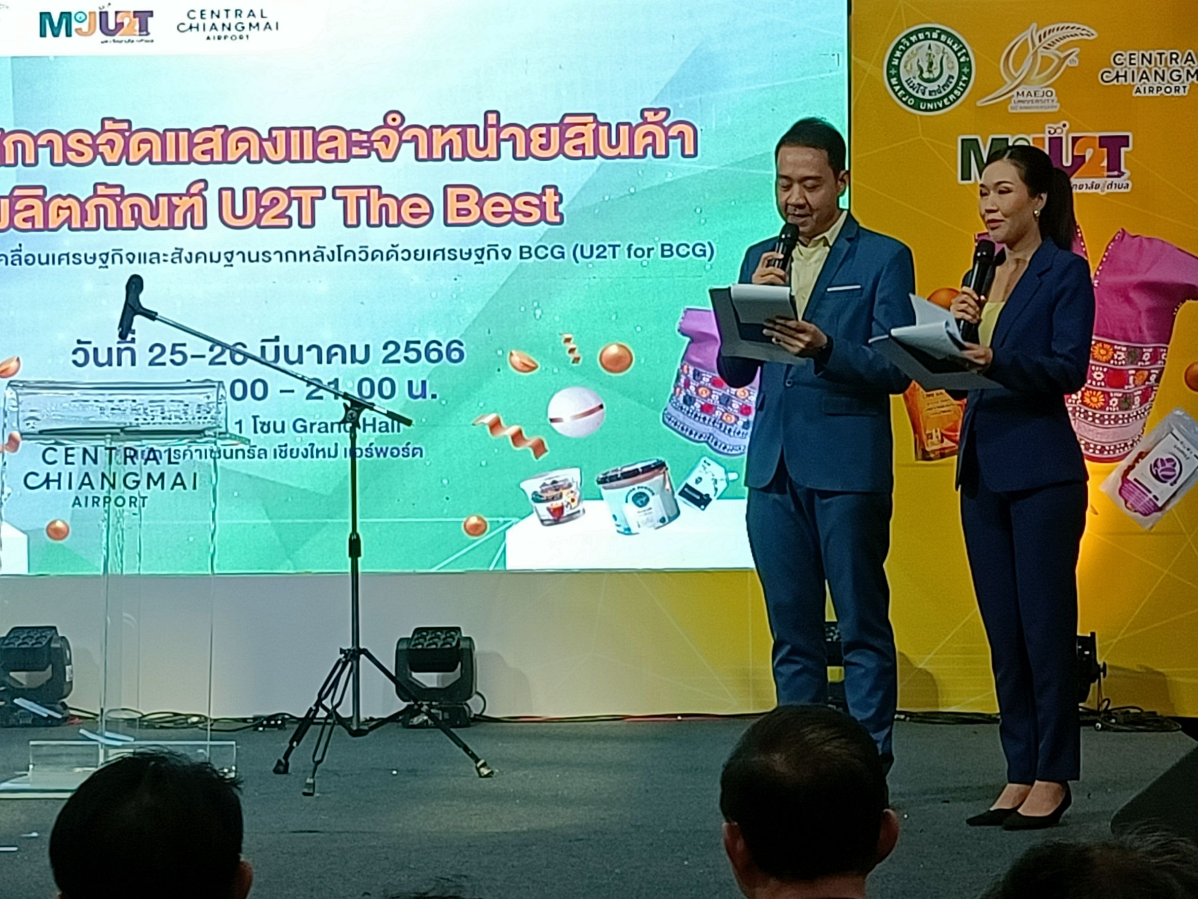 ที่ศูนย์การค้า เซ็นทรัล เชียงใหม่ แอร์พอร์ต อำเภอเมือง จังหวัดเชียงใหม่ นายพันธุ์เพิ่มศักดิ์ หัวหน้ากลุ่มภารกิจบริหารยุทธศาสตร์ สำนักงานปลัดกระทรวงการอุดมศึกษา วิทยาศาสตร์ วิจัยและนวัตกรรม พร้อมด้วย รองศาสตราจารย์ ดร.วีระพล ทองมา อธิการบดีมหาวิทยาลัยแม่โจ้ และคณะผู้บริหารของมหาวิทยาลัยแม่โจ้ ร่วมเปิดการจัดนิทรรศการแสดงและจำหน่ายสินค้าผลิตภัณฑ์ U2T the Best ภายใต้โครงการขับเคลื่อนเศรษฐกิจและสังคมฐานรากหลังโควิดด้วยเศรษฐกิจ BCG