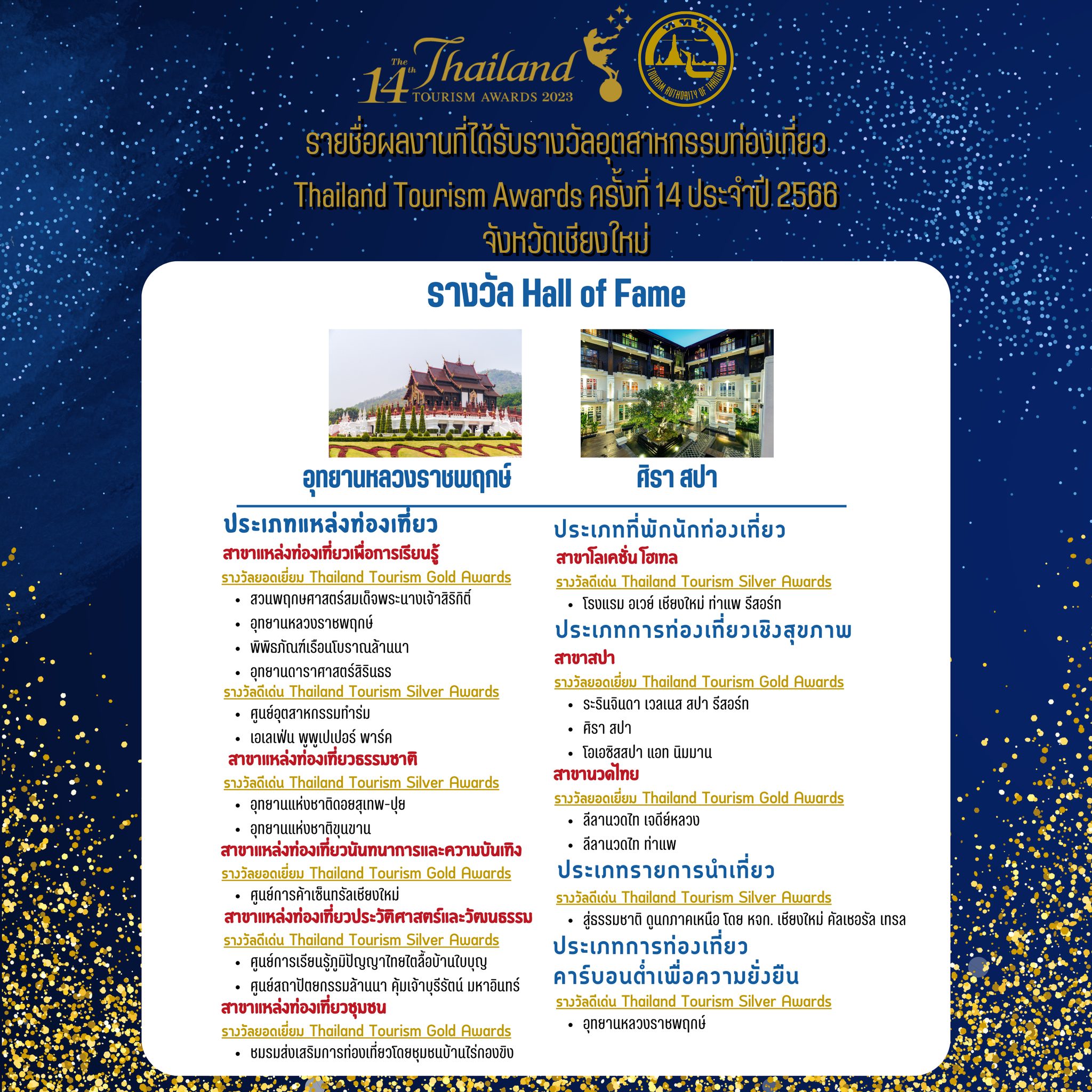 ขอแสดงความยินดีอย่างยิ่งกับความสำเร็จของผู้ได้รับรางวัลอุตสาหกรรมท่องเที่ยวไทย (Thailand Tourism Awards 2023 : TTA) ครั้งที่ 14 ประจำปี 2566 จากจังหวัดเชียงใหม่ ![]()