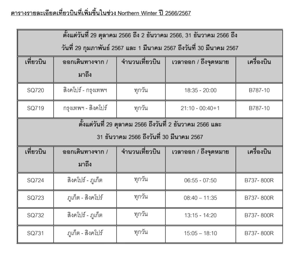 สิงคโปร์ แอร์ไลน์ส (SIA) รายงานว่า เตรียมเพิ่มบริการเที่ยวบินระหว่างสิงคโปร์และไทยช่วงตารางบินฤดูหนาว (Northern Winter) ปี 2566/2567 เริ่มตั้งแต่ 29 ตุลาคม 2566 เป็นต้นไป ไป-กลับ 2 เส้นทางหลัก ได้แก่ เส้นทางที่ 1 กรุงเทพฯ-สิงคโปร์ จะเพิ่มขึ้นเป็น 6 เที่ยว/วัน จากปัจจุบัน 5 เที่ยว/วัน โดยใช้เครื่องบินเครื่องบินโบอิ้ง 787-10 ดรีมไลเนอร์ และเส้นทางที่ 2 ภูเก็ต-สิงคโปร์ จะเพิ่มขึ้นเป็น 6 เที่ยว/วัน จากปัจจุบัน 4 เที่ยว/วัน จะให้บริการด้วยเครื่องบินโบอิ้ง 737-8