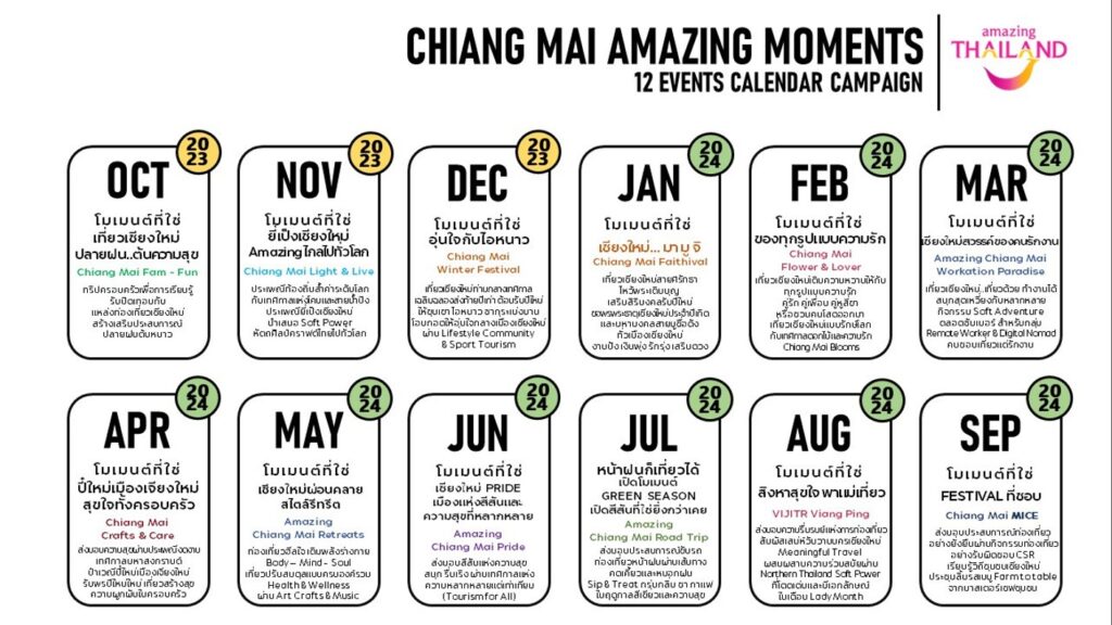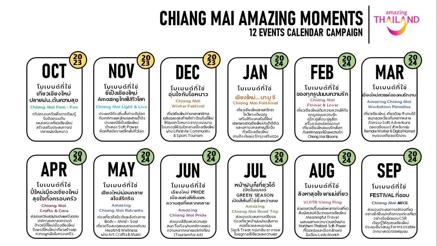 โดยการท่องเที่ยวแห่งประเทศไทย สำนักงานเชียงใหม่ ได้จัดทำปฏิทินท่องเที่ยวตลอด 12 เดือน เพื่อให้นักท่องเที่ยวสามารถเดินทางมาได้ตลอดทั้งปี สำหรับในช่วงปลายปีนี้ หลายหน่วยงานทั้งภาครัฐ ภาคเอกชน ได้เตรียมจัดกิจกรรมมากมายไว้สำหรับรองรับนักท่องเที่ยว