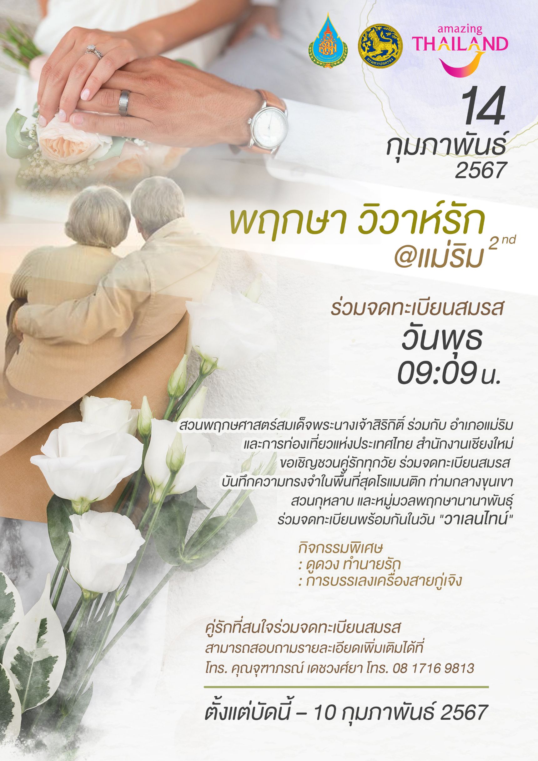 🌹สวนพฤกษศาสตร์สมเด็จพระนางเจ้าสิริกิติ์ ร่วมกับ อำเภอแม่ริม และการท่องเที่ยวแห่งประเทศไทยสำนักงานเชียงใหม่ ขอเชิญเข้าร่วม บันทึกรักในวันแห่งความรัก “พฤกษา..วิวาห์รัก” ชวนคู่รักมาจดทะเบียนสมรสบันทึกรัก ท่ามกลางบรรยากาศโรแมนติกและกลิ่นหอมของดอกกุหลาบ พร้อมพรรณไม้นานาพันธุ์