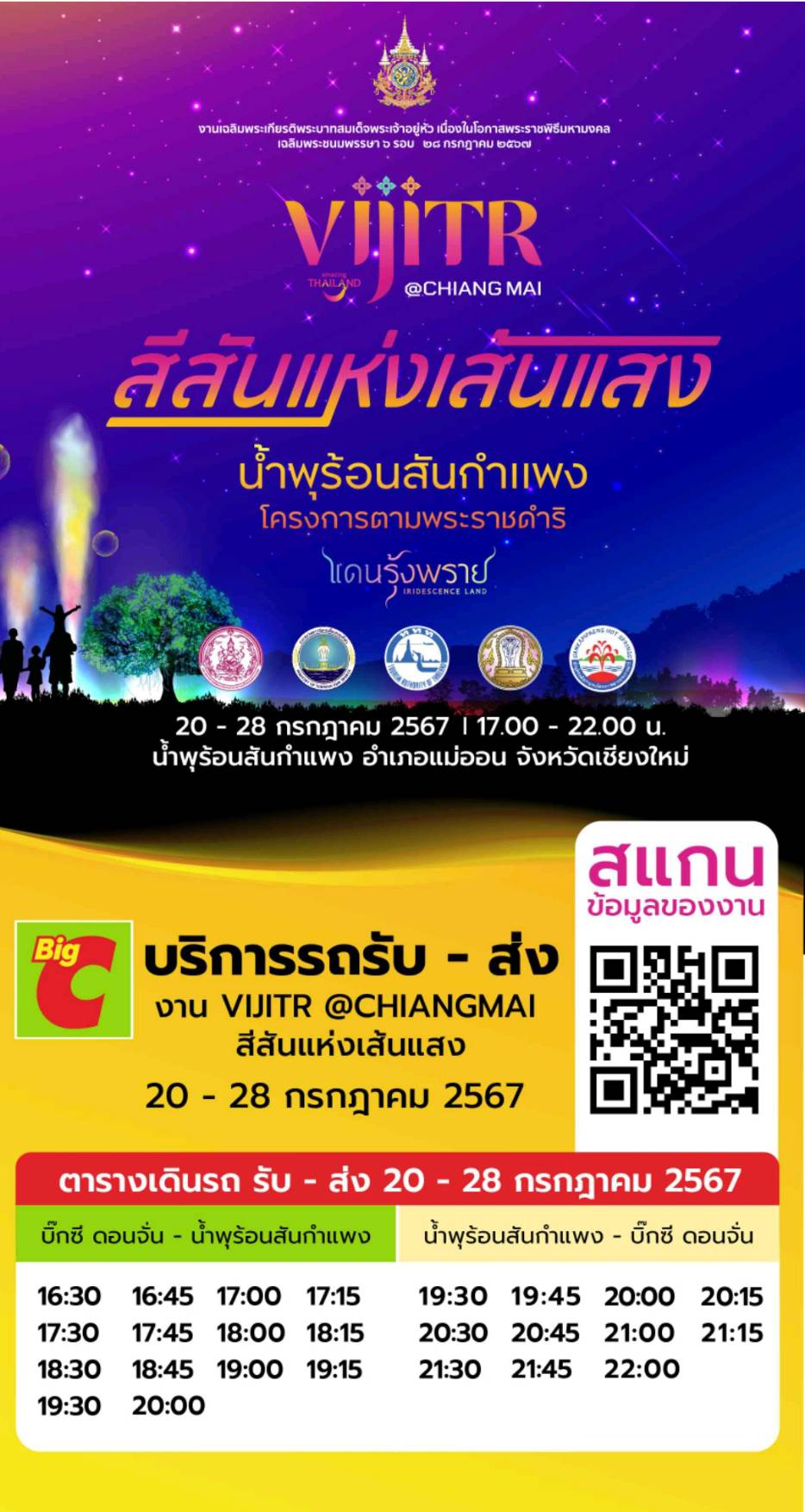 กระทรวงการท่องเที่ยวและกีฬา โดยการท่องเที่ยวแห่งประเทศไทย (ททท.) ร่วมกับ จังหวัดเชียงใหม่ กิจการน้ำพุร้อนสันกำแพงโครงการตามพระราชดำริ ชุมชนบริเวณรอบนำพุร้อนสันกำแพง บริษัท บิ๊กซี ซุปเปอร์เซ็นเตอร์ จำกัด และหน่วยงานภาครัฐ ภาคเอกชนในพื้นที่ จัดงาน “วิจิตร@เชียงใหม่ สีสันแห่งเส้นแสง น้ำพุร้อนสันกำแพง โครงการตามพระราชดำริ” ครั้งที่ 2 ภายใต้แนวคิด “แดนรุ้งพราย (Iridescence Land)” โดยจัดแสดงนวัตกรรมแสง เสียง สุดตระการตา 10 จุดแสดง สะท้อนถึงปรัชญาเศรษฐกิจพอเพียงและ ความวิจิตรของวัฒนธรรมเมืองล้านนา เพื่อเฉลิมพระเกียรติพระบาทสมเด็จพระเจ้าอยู่หัว เนื่องในโอกาสพระราชพิธีมหามงคลเฉลิมพระชนมพรรษา 6 รอบ 28 กรกฎาคม 2567 รวมทั้งบอกเล่าเรื่องราววิถีชีวิตจากอดีตถึงปัจจุบันของโครงการหมู่บ้านสหกรณ์สันกำแพง ในวันที่ 20 – 28 กรกฎาคม 2567 เวลา 17.00 – 22.00 น. ณ กิจการน้ำพุร้อนสันกำแพง อำเภอแม่ออน จังหวัดเชียงใหม่