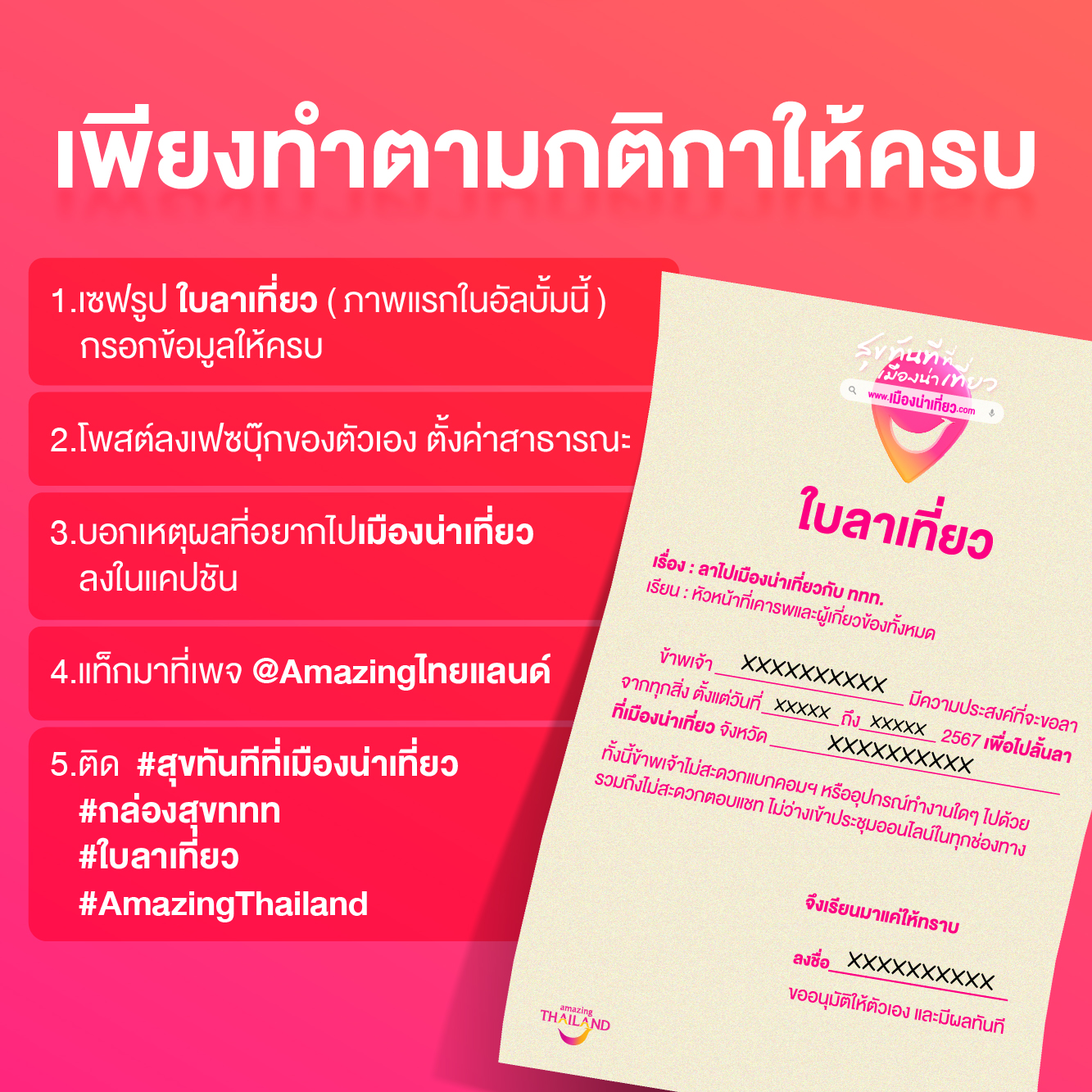 4.อย่าลืมแท็กมาที่เพจ @Amazing ไทยแลนด์ (ไทยแลนด์ ภาษาไทยเท่านั้น)