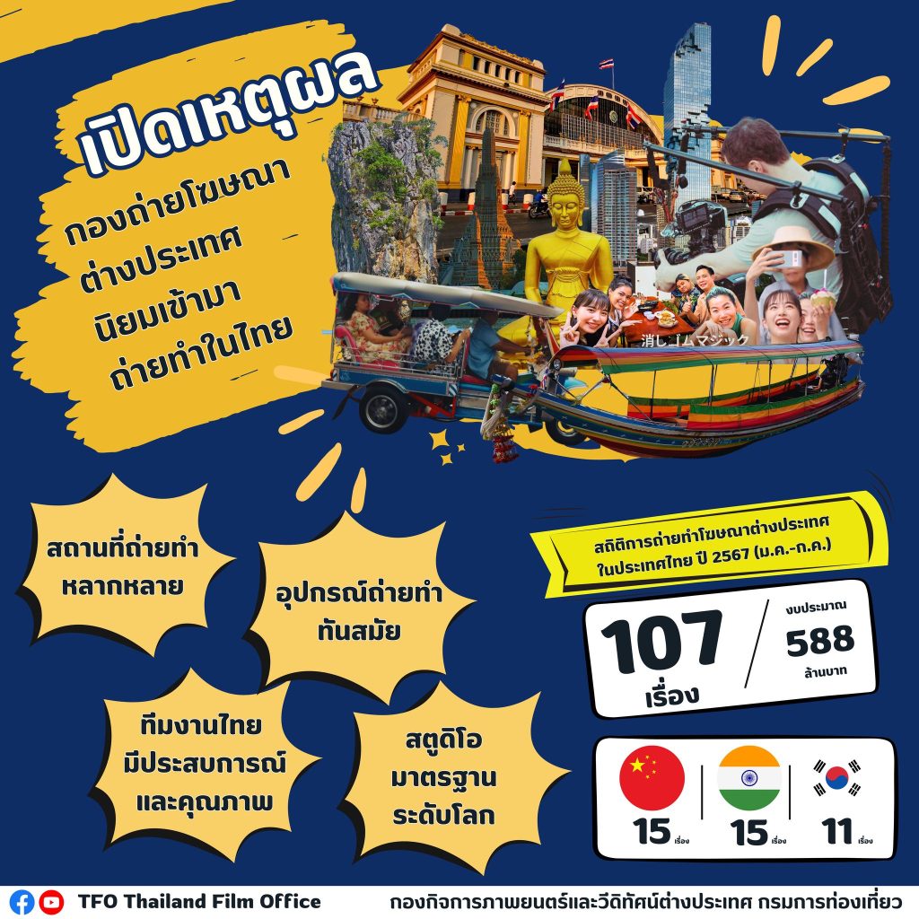 ในปี พ.ศ. 2567 (มกราคม – กรกฎาคม) ข้อมูล ณ วันที่ 26 กรกฎาคม 2567 พบว่า มีกองถ่ายทำภาพยนตร์โฆษณาต่างประเทศจาก 21 ประเทศทั่วโลก เข้ามาถ่ายทำในประเทศไทย จำนวน 107 เรื่อง โดยประเทศ