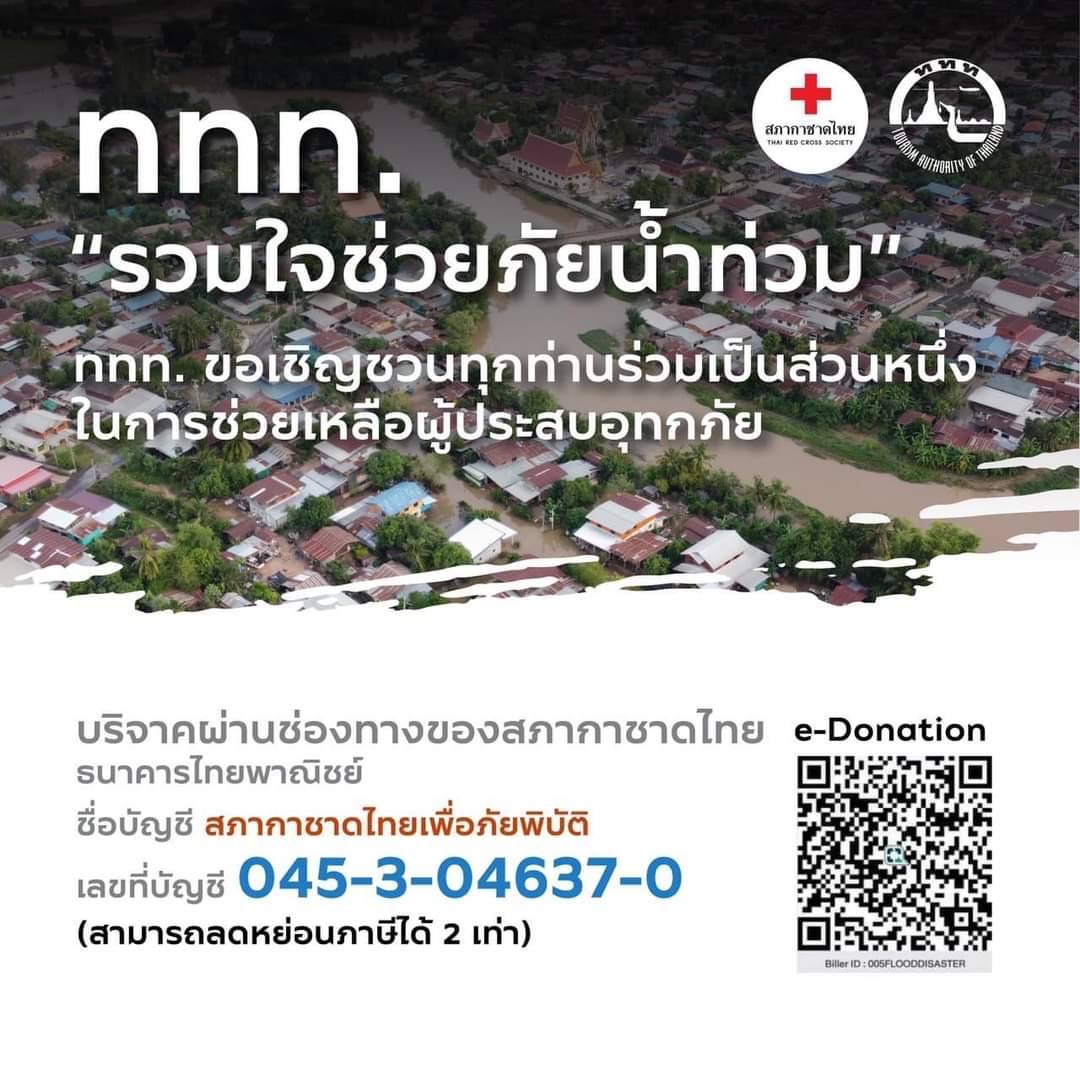 2.บริจาคผ่านช่องทางของสภากาชาดไทย ธนาคารไทยพาณิชย์ ชื่อบัญชี สภากาชาดไทยเพื่อภัยพิบัติ เลขที่บัญชี 045-3-04637-0 (สามารถลดหย่อนภาษีได้ 2 เท่า