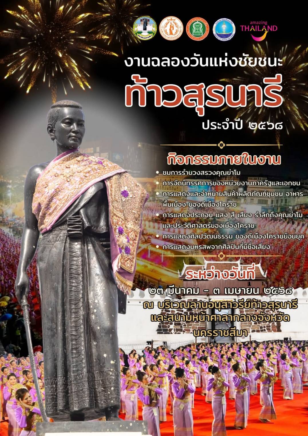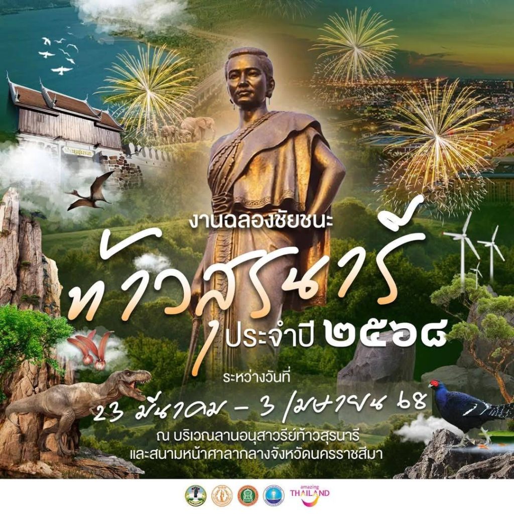 ททท.อีสานชวนเที่ยว #งานฉลองชัยชนะท้าวสุรนารี ประจำปี 2568 🎯ระหว่างวันที่ 23 มีนาคม – 3 เมษายน 2568 ณ บริเวณหน้าศาลากลางจังหวัดนครราชสีมา 😇✨ 🟢 #กิจกรรมไฮไลต์ภายในงาน ▪️ การแสดงแสงสีเสียงตำนานย่าโม – ถ่ายทอดเรื่องราวความกล้าหาญของวีรสตรีโคราชผ่านการแสดงสุดอลังการทุกคืน ✨ ▪️ โซนร้านอาหารชื่อดังจากทั่วประเทศ – คัดสรรเมนูเด็ดจากร้านยอดนิยมมาให้ทุกคนได้ลิ้มลอง🤤 ▪️ ตลาดท้องถิ่น – สนับสนุนสินค้าและของดีจากชุมชนในพื้นที่🛍️ 📍#ชมฟรี ,คอนเสิร์ตศิลปินดัง ,งานย่าโมโคราช สุดอลังการ จัดยิ่งใหญ่ 12 วันเต็ม 🎶🔥 #งานย่าโม2568 #สุขทันทีที่เที่ยวโคราช #อีสานfestiเว้า #ประเพณีสีอีสานวิถีแห่งศรัทธา Post navigation ททท.อีสาน ชวนมาบินลัดฟ้า #เที่ยวอีสาน อุ่นใจไปกับแอร์เอเชีย.หมู่บ้านภาคเหนือ ในงานเทศกาลเที่ยวเมืองไทย (ครั้งที่ 43) 26-30 มีนาคม 2568 ศูนย์การประชุมแห่งชาติสิริกิติ์