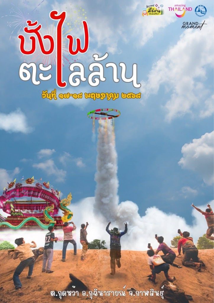 บุญบั้งไฟเดือนหก กลับบ้านเฮามาเอาบุญเดือนหก’.. ระเบิดฟ้า ปลุกพลังศรัทธา ‘บุญบั้งไฟตะไลล้าน’ หนึ่งเดียวในโลก ที่จะทำให้หัวใจคุณเต้นตึ้บๆ ไปกับ เสียงสนั่นของบั้งไฟหมื่นแสนแรงหมุน พบกับความอลังการของขบวนแห่ และการแสดงสุดยิ่งใหญ่ที่ต้องเห็นกับตา 17 -18 พ.ค. – ขบวนแห่สุดวิจิตร – จุดบั้งไฟตะไลล้าน ทะยานฟ้าสะเทือนดิน ณ บ้านกุดหว้า อ.กุฉินารายณ์ จ.กาฬสินธุ์ มากกว่าการจุดบั้งไฟ….แต่คืองานบุญใหญ่ที่ต้องสัมผัสด้วยตาตัวเองสักครั้งในชีวิต Be part of a heart-pounding celebration – only at Kut Wa’s Skyrocket Festival! KALASIN Pro. Get ready for dazzling parades and explosive sky-spinning rockets that you’ll never forget. Post navigation เชิญเที่ยวงานประเพณีบุญบั้งไฟยโสธร ประจำปี 2568 วันที่ 16-18 พฤษภาคม 2568“เมืองน่าเที่ยว Year of Celebration” แคมเปญที่จะเติมแรงบันดาลใจให้การท่องเที่ยวช่วง Green Season