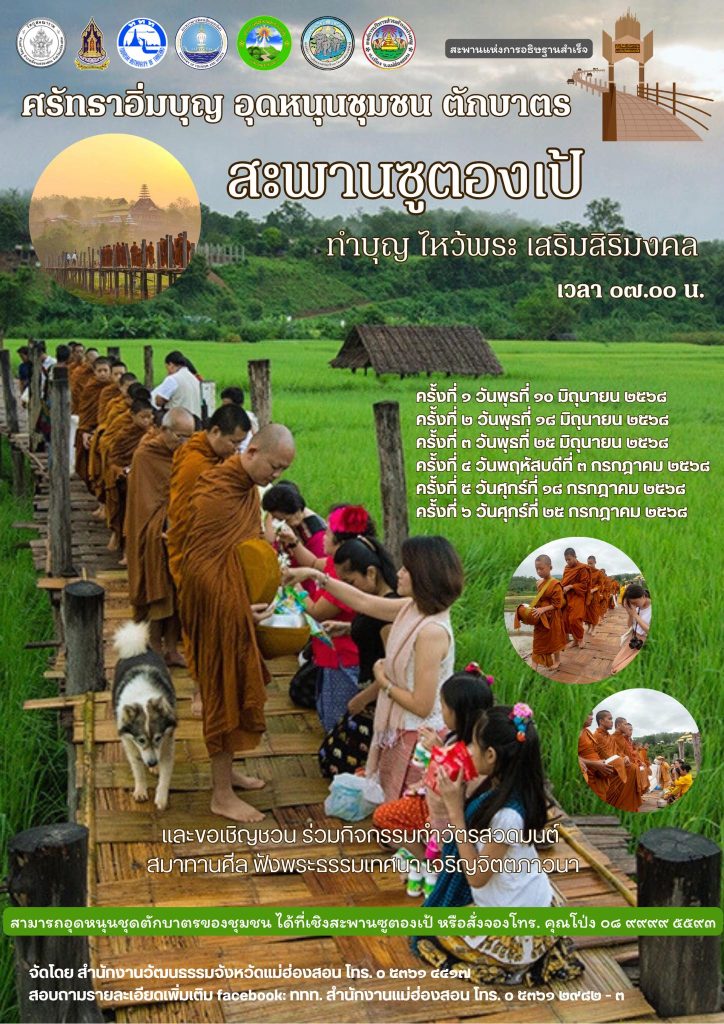 กำหนดการ ตักบาตรข้าวสารอาหารแห้ง ณ “สะพานซูตองเป้” แต่งชุดพื้นเมือง บรรยากาศสวย ๆ มาทำบุญและชมหนึ่งใน Landmark ของแม่ฮ่องสอนกัน ตามวันเวลา ที่ได้กำหนด ดังนี้