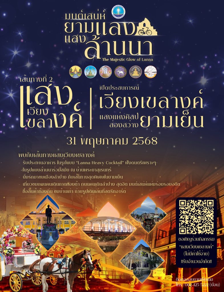 มนต์เสน่ห์ยามแลง แสงล้านนา” กิจกรรมภายใต้โครงการส่งเสริมการท่องเที่ยวเมืองเก่าอารยธรรมล้านนา จัดโดย สำนักงานการท่องเที่ยวและกีฬาจังหวัดเชียงใหม่ เส้นทางที่ 2 : แสงเวียงเขลางค์ : จังหวัดลำปาง กิจกรรมดี ๆ ที่ผสานวัฒนธรรมล้านนาเข้ากับแสงเวียงเขลางค์ รับประทานอาหาร ในรูปแบบ “Lanna Heavy Cocktail” ฟังดนตรีเพราะๆ ในรูปแบบล้านนาร่วมสมัย ณ บ้านพระยาสุเรนทร์ นั่งรถมาชมเมืองลำปาง กับเส้นทางสุดพิเศษในยามเย็น เที่ยวชมถนนคนเดินกาดกองต้า ถนนคนเดินลำปาง สุดฮิต มนต์เสน่ห์แห่งร่องรอยอดีตซื้อสินค้าท้องถิ่น ชมบ้านเก่า ถ่ายรูปเดินเล่นที่สตรีทอาร์ต ยามเย็นวันเสาร์ที่ 31 พ.ค. เวลา 16:00น. เป็นต้นไป มาร่วมเดินทางชมแสงเวียงเขลางค์ จุดนัดพบ : บ้านพระยาสุเรนทร์ (จอดรถที่สถานีรถไฟนครลำปาง)ลงทะเบียนได้ที่นี่ : https://docs.google.com/…/16LgJVVhoJ_PgvVA…/viewform…(รับจำนวนจำกัด ลงทะเบียนเข้าร่วมกิจกรรมไม่มีค่าใช้จ่าย)สอบถามรายละเอียดเพิ่มเติม โทร 0631468143ลงทะเบียนเพื่อเข้าร่วมกิจกรรม”แสงเวียงเขลางค์” ได้ที่นี่ ดูน้อยลง Post navigation รมว.ท่องเที่ยวและกีฬา เปิดงาน “Thai Fists in Thai Fest” กลางกรุงปารีส ดันมวยไทยสู่เวทีโลก หนุน Soft Power ไทยสร้างแรงบันดาลใจนักท่องเที่ยวหวานไม่ลืมในเมืองหมอกแม่ฮ่องสอน ชวนลิ้มลองขนมโบราณไทใหญ่ที่หากินที่อื่นไม่ได้
