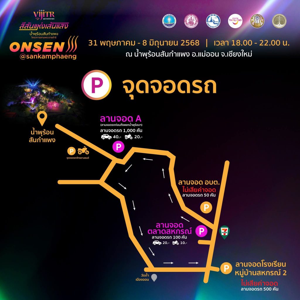 งาน “วิจิตร@เชียงใหม่ สีสันแห่งเส้นแสง น้ำพุร้อนสันกำแพง โครงการตามพระราชดำริตอน ออนเซ็น@สันกำแพง” จัดขึ้นระหว่างวันที่ 31 พฤษภาคม – 8 มิถุนายน 2568 ผู้เข้าร่วมงานจะได้สัมผัสความตระการตาของการจัดแสดงเทคนิค แสง เสียง ผสานสื่อผสมและเทคโนโลยีสมัยใหม่ผ่าน 10 จุดแสดงแสง ในลักษณะ Walking Tour ได้แก่