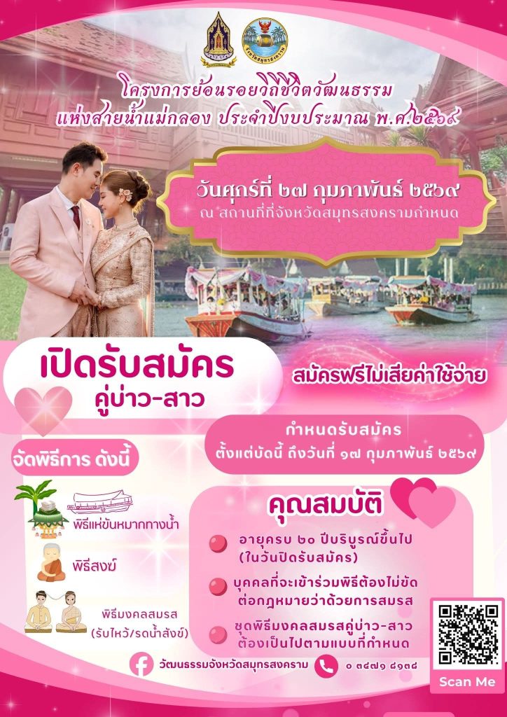 จังหวัดสมุทรสงคราม โดยสำนักงานวัฒนธรรมจังหวัดสมุทรสงคราม ประกาศรับสมัครคู่บ่าวสาว เข้าร่วมพิธีมงคลสมรส ตามโครงการย้อนรอยวิถีชีวิตวัฒนธรรมแห่งสายน้ำแม่กลอง ประจำปีงบประมาณ พ.ศ. ๒๕๖๙ ตั้งแต่บัดนี้เป็นต้นไป ถึงวันที่ ๑๗ กุมภาพันธ์ ๒๕๖๙ (ในวันและเวลาราชการ) สามารถดูรายละเอียดได้ที่ลิงค์ด้านล่าง