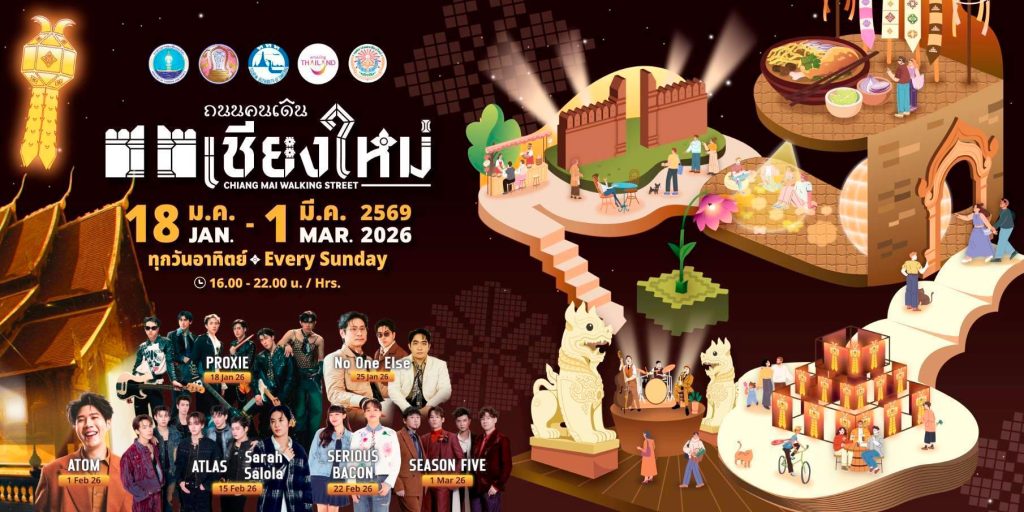 นายขจรเดช อภิชาติตรากุล ผู้อำนวยการภูมิภาคภาคเหนือ การท่องเที่ยวแห่งประเทศไทย (ททท.) เปิดเผยว่า ททท.ร่วมกับจังหวัดเชียงใหม่และองค์กรท้องถิ่น เตรียมจัดงาน “เชียงใหม่ Night Market” ระหว่าง 17 มกราคม – 1 มีนาคม 2569 จะจัดต่อเนื่อง 6 สัปดาห์ ทุกวัน 10.00 – 22.00 น. โปรโมท 2 ถนนคนเดิน ได้แก่ สันกำแพง (ทุกวันเสาร์) และท่าแพ เชียงใหม่ (ทุกวันอาทิตย์) ภายใต้แนวคิด Tha Phae Remix Chiang Mai Remake และ San Kamphaeng Remix Chiang Mai Remake เชิญชวนนักท่องเที่ยวสัมผัสมนต์เสน่ห์ถนนคนเดินเชียงใหม่ กระตุ้นการเดินทางจากพื้นที่เมืองหลักสู่เมืองน่าเที่ยว เพิ่มรายได้ช่วงต้นปี 2569 ให้ได้ไม่ต่ำกว่า 186 ล้านบาท
