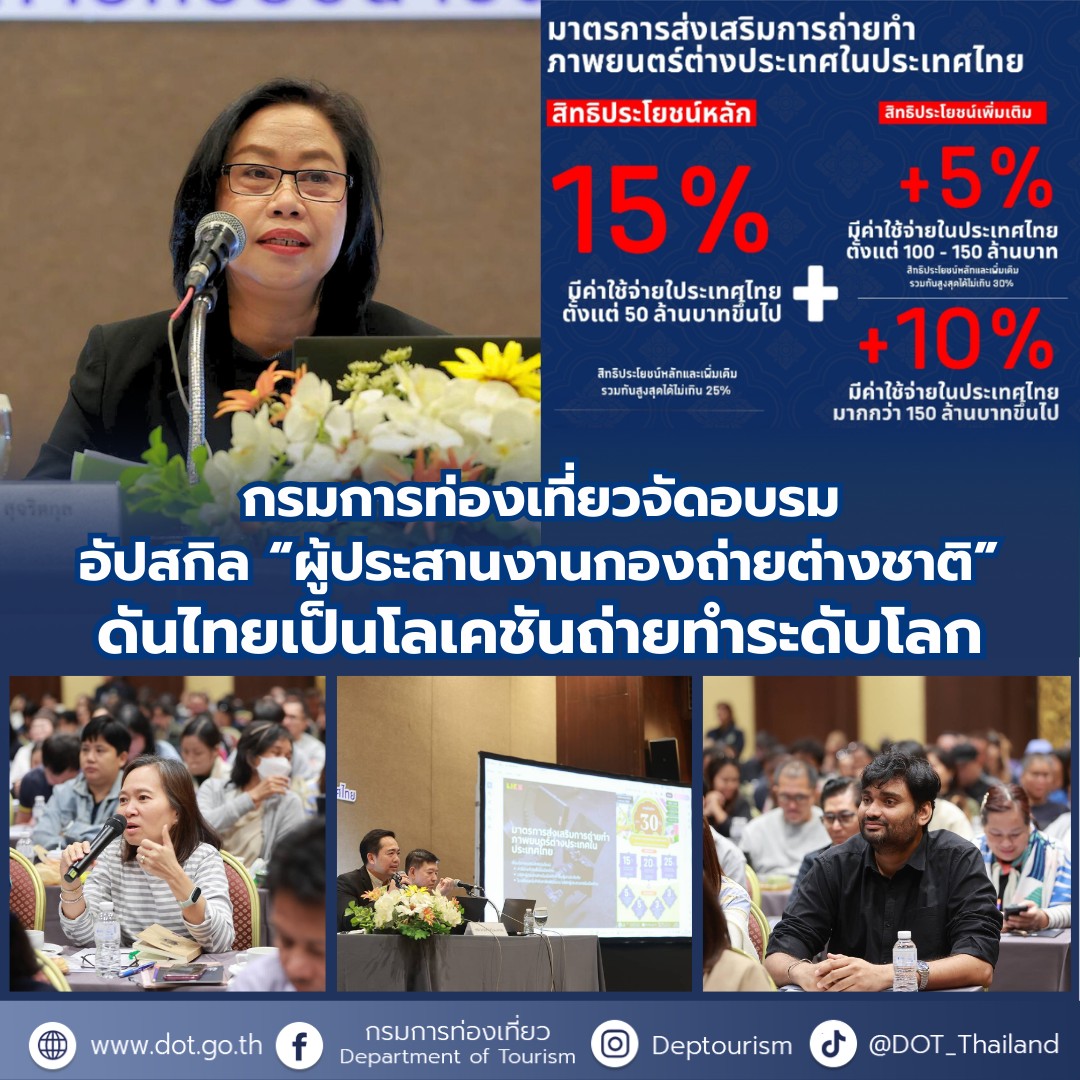 วันพฤหัสบดีที่ 29 มกราคม 2569 เวลา 09.00 น. อธิบดีกรมการท่องเที่ยวมอบหมายให้ นางสาวอุบลวรรณ สุจริตกุล ผู้อำนวยการกองกิจการภาพยนตร์และวีดิทัศน์ต่างประเทศ เป็นประธานเปิดการอบรมเพื่อพัฒนาผู้ประสานงานการถ่ายทำภาพยนตร์ต่างประเทศในประเทศไทย และบุคลากรที่เกี่ยวข้อง ประจำปีงบประมาณ พ.ศ. 2569 เรื่อง วิธีการ ขั้นตอน กฎ และระเบียบที่เกี่ยวข้องในการขออนุญาตถ่ายทำภาพยนตร์ต่างประเทศในประเทศไทย