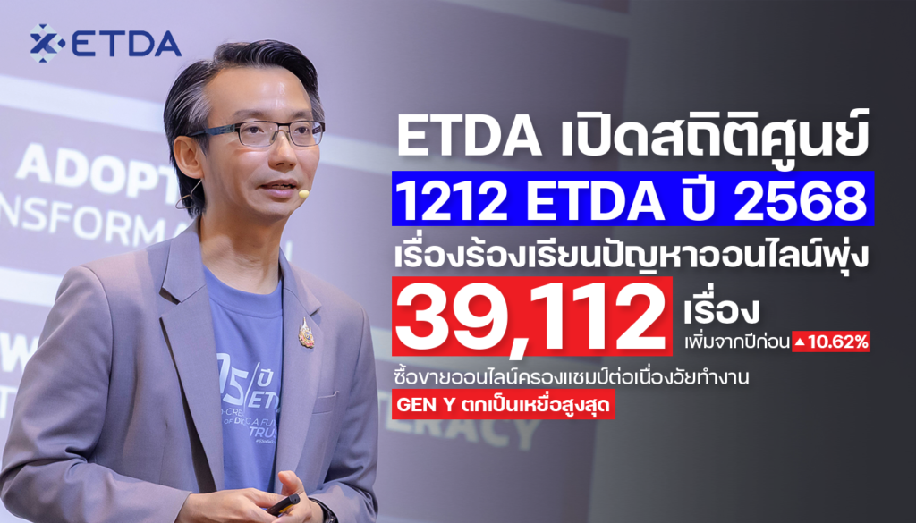 สำนักงานพัฒนาธุรกรรมทางอิเล็ กทรอนิกส์ (สพธอ.) หรือ ETDA เปิดสถิติรับเรื่องร้องเรี ยนปัญหาออนไลน์ของศูนย์ช่วยเหลื อและจัดการปัญหาออนไลน์ หรือ 1212 ETDA รอบปี 2568 พบ เรื่องร้องเรียนรวม 39,112 เรื่อง เพิ่มจากปี 2567 ถึง 3,754 เรื่อง คิดเป็น 10.62% ‘ปัญหาซื้อขายออนไลน์-เว็บเถื่ อน’ ยังครองแชมป์ต่อเนื่อง กลุ่มวัยทำงาน (Gen Y และ X) เสี่ยงตกเป็นเหยื่อถูกหลอกแซงผู้ สูงอายุ สูงถึง 71% ของผู้ร้องเรียนทั้งหมด เหตุทำธุรกรรมและเปิดเผยข้อมู ลส่วนตัวในโลกออนไลน์เป็นประจำ พร้อมเร่งเสริมกลไกร่วมกำกั บภายใต้กฎหมาย DPS ดูแล ‘สินค้า-บริการผิดกฎหมาย-ยืนยั นตัวตนผู้ใช้งาน’ บนแพลตฟอร์ม ปิดช่องโหว่แก้ปมมิจฉาชีพเข้ม