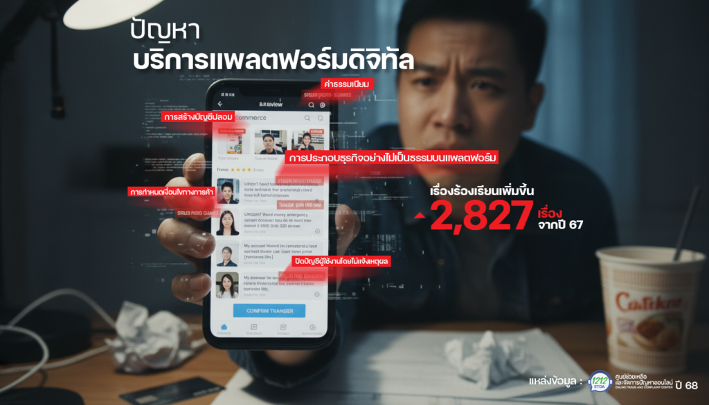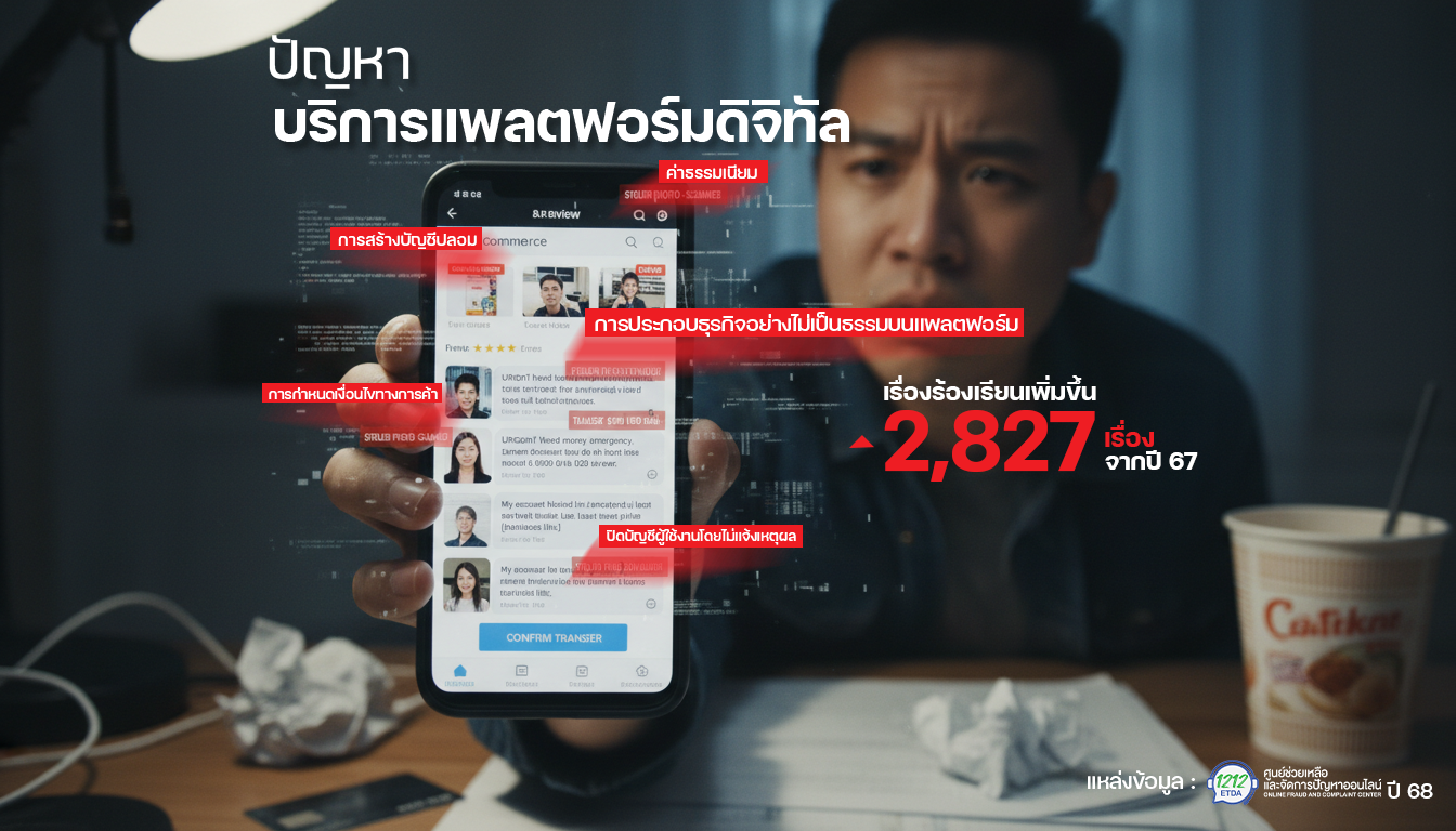 เมื่อวิเคราะห์เชิงลึกระหว่างปี 2567-2568 จากการให้บริการรับเรื่องปัญหา การให้บริการแพลตฟอร์มดิจิทัล พบว่า มีเรื่องร้องเรียนเพิ่มขึ้นทั้ งหมด 2,827 เรื่อง โดยปัญหาจากบริการแพลตฟอร์มดิจิ ทัลที่พบมากสุด ได้แก่ 1.การประกอบธุรกิจอย่างไม่เป็ นธรรมบนแพลตฟอร์ม เช่น การกำหนดเงื่อนไขทางการค้า ค่าธรรมเนียม นโยบาย ที่เอื้อประโยชน์ต่อผู้ประกอบธุ รกิจมากกว่าผู้ใช้บริการ หรือปิดบัญชีผู้ใช้งานโดยไม่แจ้ งเหตุผล การไม่ได้รับการเยียวยาความเสี ยหาย 2.ปัญหาการคุ้มครองข้อมูลส่วนบุ คคล เช่น การนำข้อมูลไปใช้โดยไม่ได้รั บความยินยอม การสร้างบัญชีปลอม และการเผยแพร่ข้อมูลส่วนบุคคล และ 3.ปัญหาการเรียกรถผ่านแอปพลิ เคชัน ที่มีอัตราการเพิ่มขึ้นเมื่อเที ยบกับปี 2567 ทั้งกรณีเรียกเก็บค่าบริการไม่ เป็นธรรม ราคาที่แสดงไม่ตรงกับยอดที่จ่ ายจริง การยกเลิกรถโดยไม่แจ้งล่วงหน้ าและการให้บริการที่ไม่เป็ นไปตามเงื่อนไข